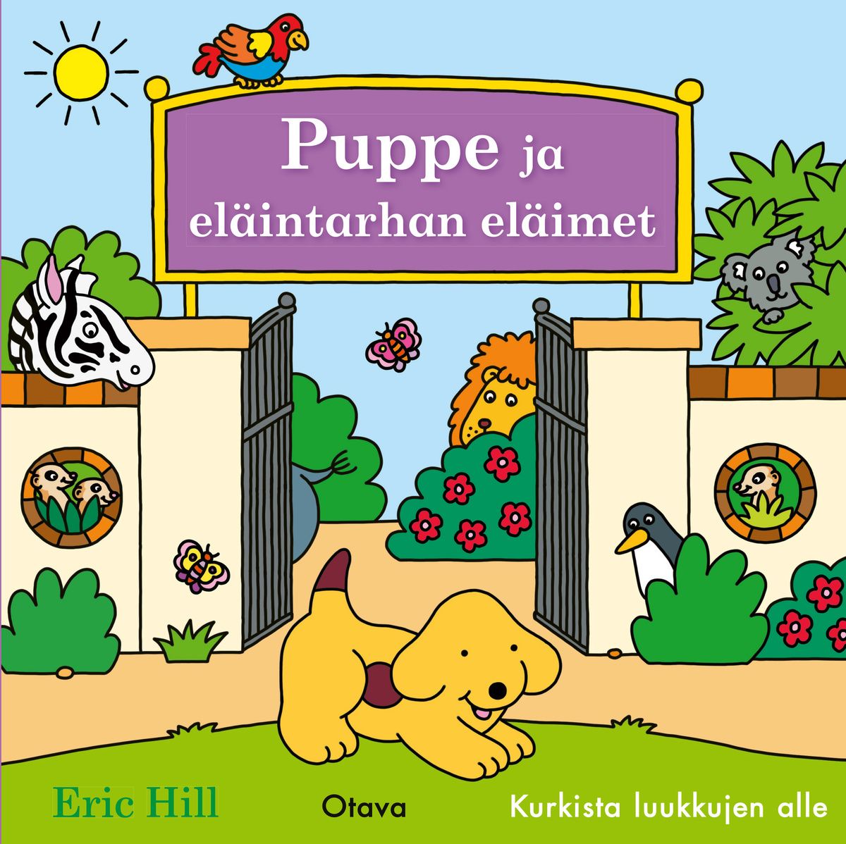 Iloinen kurkistusluukkukirja eläintarhan eläimistä pienille lapsille.